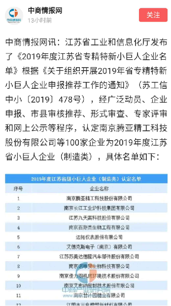 中商情报网讯:江苏省工业和信息化厅发布了《2019年度江苏省专精特新小巨人企业名单》根据《关于组织开展2019年省专精特新小巨人企业申报推荐工作的通知》(苏工信中小【2019】478号),经广泛动员、企业申报、市县审核推荐、形式审查、专家评审和网上公示等程序,认定南京腾亚精工科技股份有限公司等100家企业为2019年度江苏省小巨人企业(制造类)